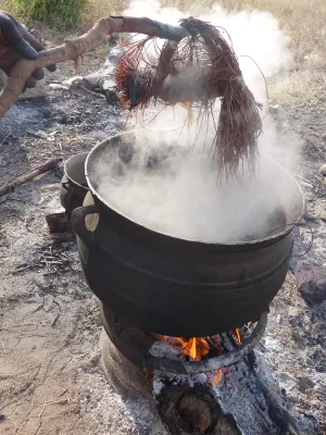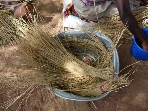 The fibre used in Ghana for basketry comes from a wild grass, Pennisetum purpureum, commonly known as 'elephant grass'. Each fibre has to be split and twisted before being woven, and it takes about three days to make a medium-sized basket. This technique, which is time-consuming but produces flexible and tightly woven baskets, is mainly used by women.