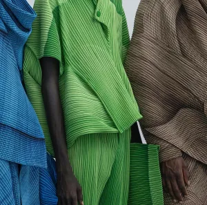 In contrast, Issey Miyake’s pleats define space through the textile itself. The soft fabric doesn’t conform to the body — it generates its own volume, with folds as a structural principle.